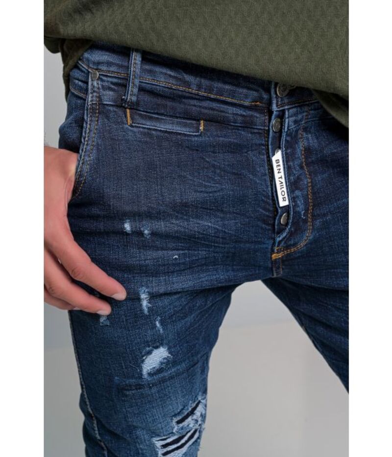 Ανδρικό Jean Ben tailor Montreal σε μπλε. Διαθέτει διπλή πατιλέτα με διακριτικό δερματάκι πάνω με το λογότυπο της Ben Tailor, επίσης κλείνει με inox κουμπιά με το λογότυπο της Ben Tailor..Διαθέτει 5 τσέπες, 2 μπροστά που η μια είναι διπλή με μικρότερη τσέπη και δυο πίσω. Ακόμα διαθέτει τεχνητές φθορές και handmade ξεβάμματα, επίσης έχει λάστιχο στους αστραγάλους. Έχει ελαστικότητα για καθημερινή χρήση. Η γραμμή του είναι slim fit. Jean για άνδρες κάθε ηλικίας από υψηλή ποιότητα και σύγχρονο design,οπού μπορεί να συνδυαστεί με ένα t-shirt με φούτερ(ζακέτα)από την συλλογή μας για ένα casual look για να ξεχωρίζετε.